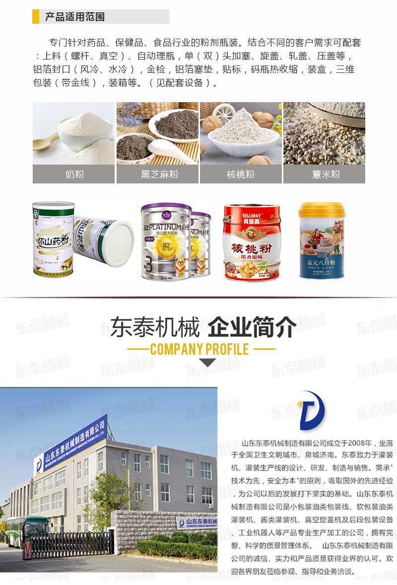 全自動粉劑灌裝機適用于包裝粉末及小顆粒物料,如粉劑、小顆粒劑藥品、獸藥、葡萄糖、調(diào)味品、固體飲料、碳粉、爽身粉、農(nóng)藥等。