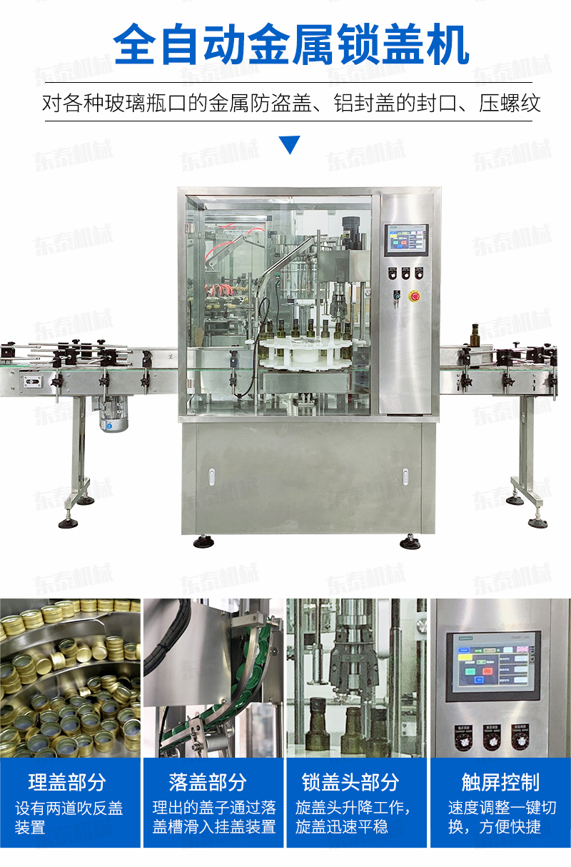 本設備適用于食品、化妝品、化工等行業,主要針對各種玻璃瓶口的金屬防盜蓋鋁封蓋的封口、壓螺紋等。該設備可單機使用,也可以與灌裝機等設備組成生產流水線自動作業;