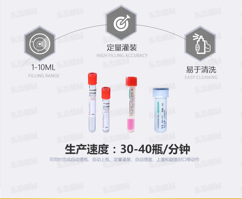本機是在引進和吸收國外技術的基礎上,由我公司自主研發(fā)的一款IVD診斷試劑灌裝旋蓋一體機,能同時完成自動理瓶、自動上瓶、定量灌裝、自動理蓋、上蓋和旋蓋封口等動作。本機采用日本高精度封閉式凸輪分度工位器,精度高,運行可靠,使用壽命長。該分度器結構簡單,長期使用無需維修。該型號設備主要用于ⅣD體外診斷試劑制藥、生物制藥行業(yè)及科研領域裝。機器設計緊湊合理、外形簡潔美觀,灌裝量調節(jié)方便。