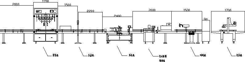 | 方案設計一:灌裝機+壓蓋機+貼標機+自動膠帽熱縮機+噴碼機+封箱機 |