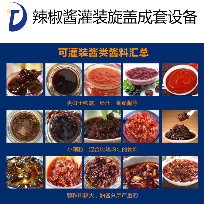辣椒醬灌裝機采用活塞式灌裝原理,適用于調味品中帶顆粒并且濃度較大的辣椒醬、豆瓣醬、花生醬、香菇醬、果醬、牛油火鍋底料、紅油火鍋底料、蝦醬等較為粘稠醬類的灌裝。