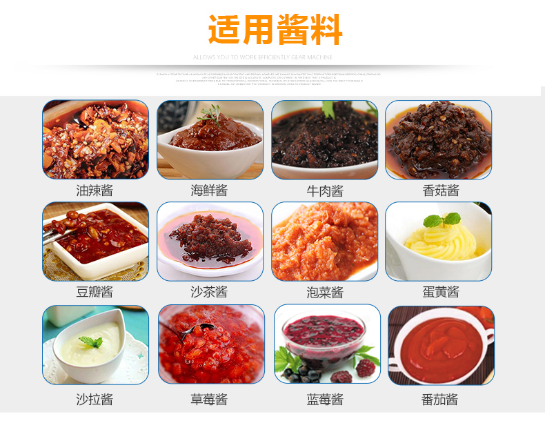 顆粒醬灌裝機采用活塞式灌裝原理,適用于調(diào)味品中帶顆粒并且濃度較大的辣椒醬、豆瓣醬、花生醬、香菇醬、果醬、牛油火鍋底料、紅油火鍋底料、蝦醬等較為粘稠醬類的灌裝。