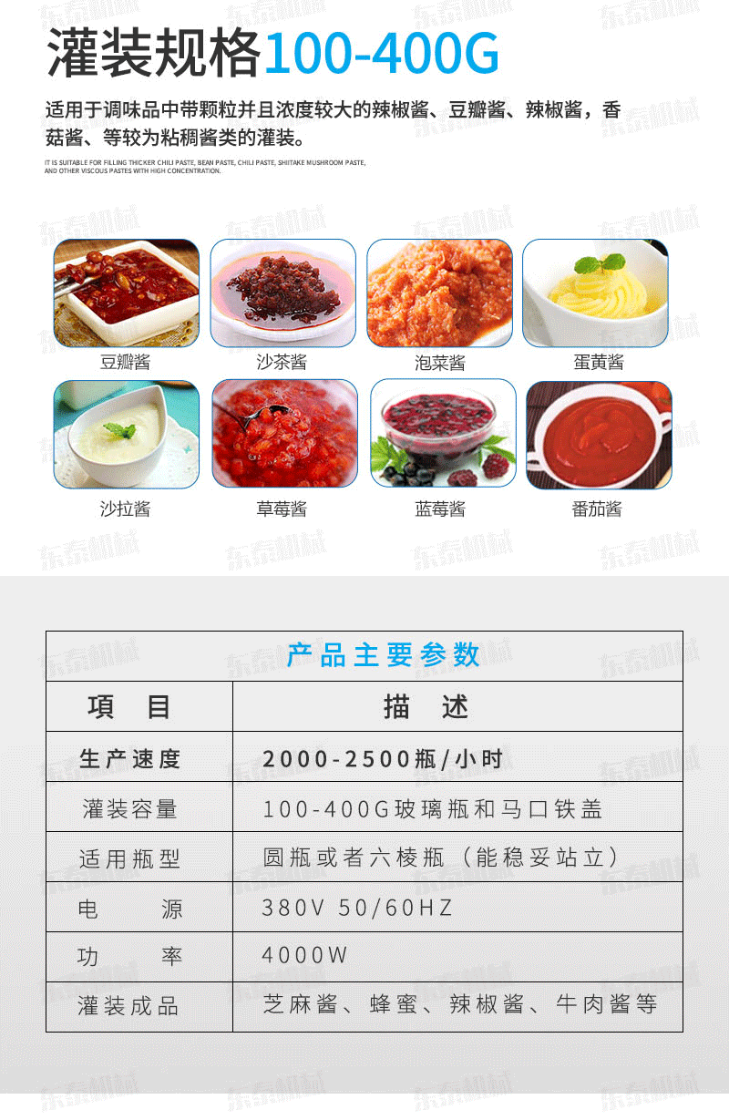 番茄醬是由西方傳入中國的一種新食品,是番茄醬加糖、食鹽在色拉油里炒熟而制成的,呈紅褐色、醬狀、體質(zhì)細(xì)膩、味酸甜,微有香辣味,還可以烹飪甜辣風(fēng)味的菜肴,做出的食品更誘人食欲,是人們喜愛的生活調(diào)味品之一。近幾年,沙司番茄醬的需求量呈逐年增長的趨勢(shì)發(fā)展,不僅在歐美地區(qū),國內(nèi)市場(chǎng)對(duì)它的需求也在不斷增多,隨著沙司口味的不斷增多,番茄醬灌裝機(jī)生產(chǎn)線的需求量也在增多,該全自動(dòng)番茄醬灌裝機(jī)生產(chǎn)線是迅捷機(jī)械借鑒國外技術(shù),自行研發(fā)的一款新一代灌裝機(jī),設(shè)計(jì)合理,運(yùn)行可靠。